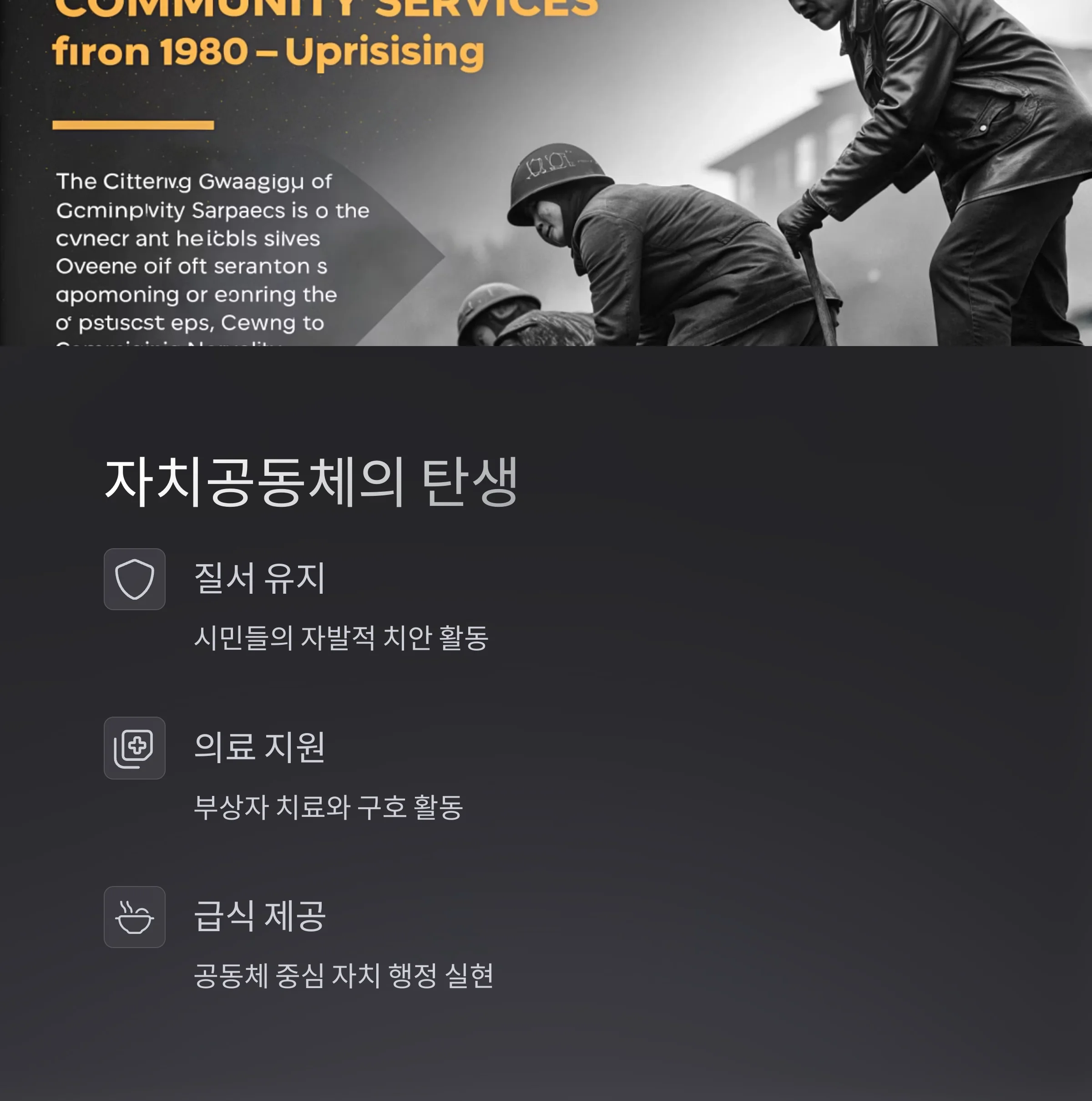 시민들은 자발적으로 질서 유지, 의료 지원, 급식 제공을 수행하며, 비폭력적이고 공동체 중심적인 자치 행정을 실현했습니다.