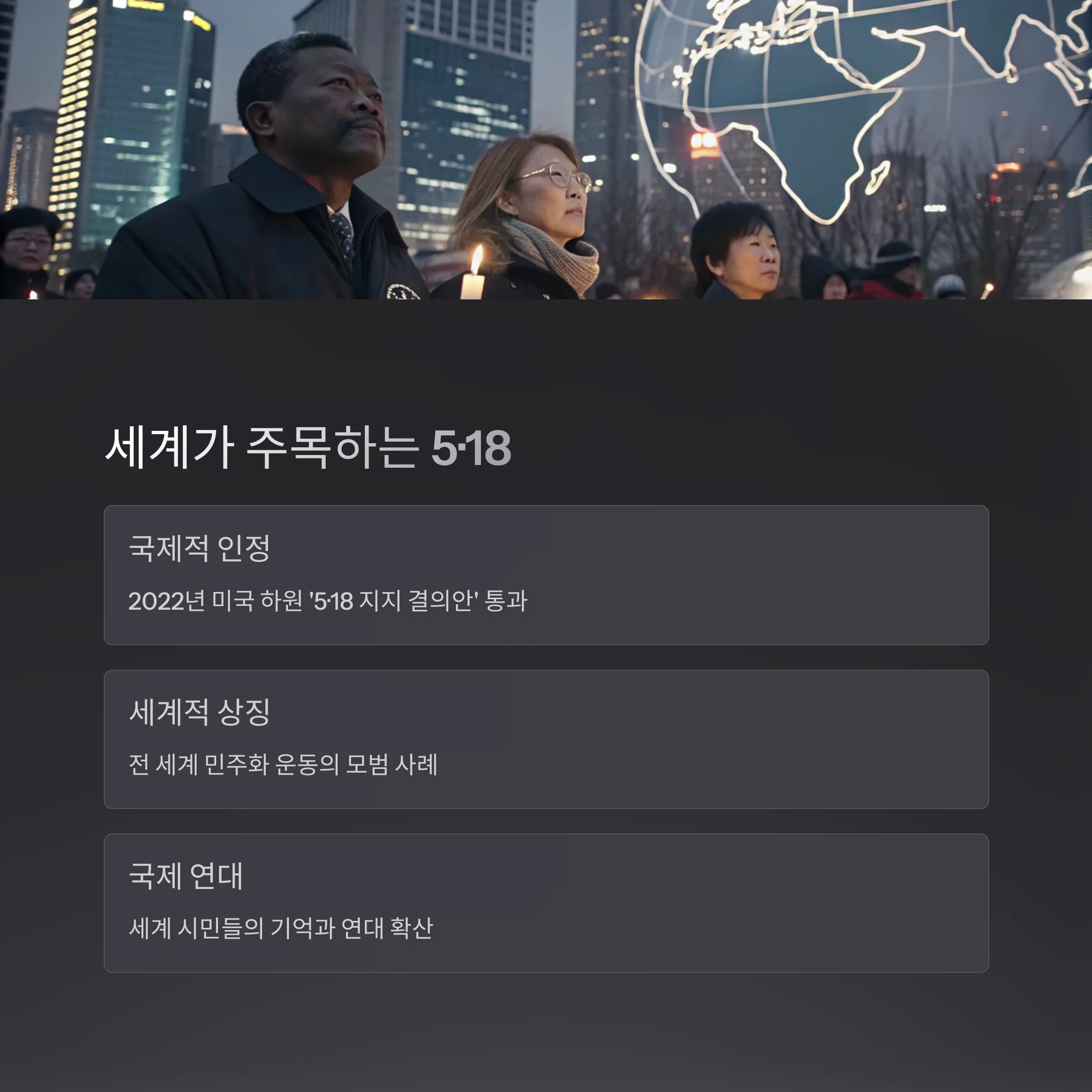 2022년 미국 하원이 '5·18 광주 민주화운동 지지 결의안'을 통과시키는 등, 이 운동은 이제 한국을 넘어 전 세계적 민주화 운동의 상징으로 평가받고 있습니다.