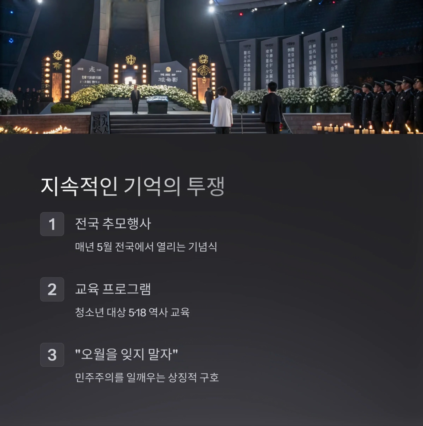 오월을 잊지 말자는 외침은 지금도 한국 사회의 민주주의를 일깨우는 상징으로 남아 있습니다.