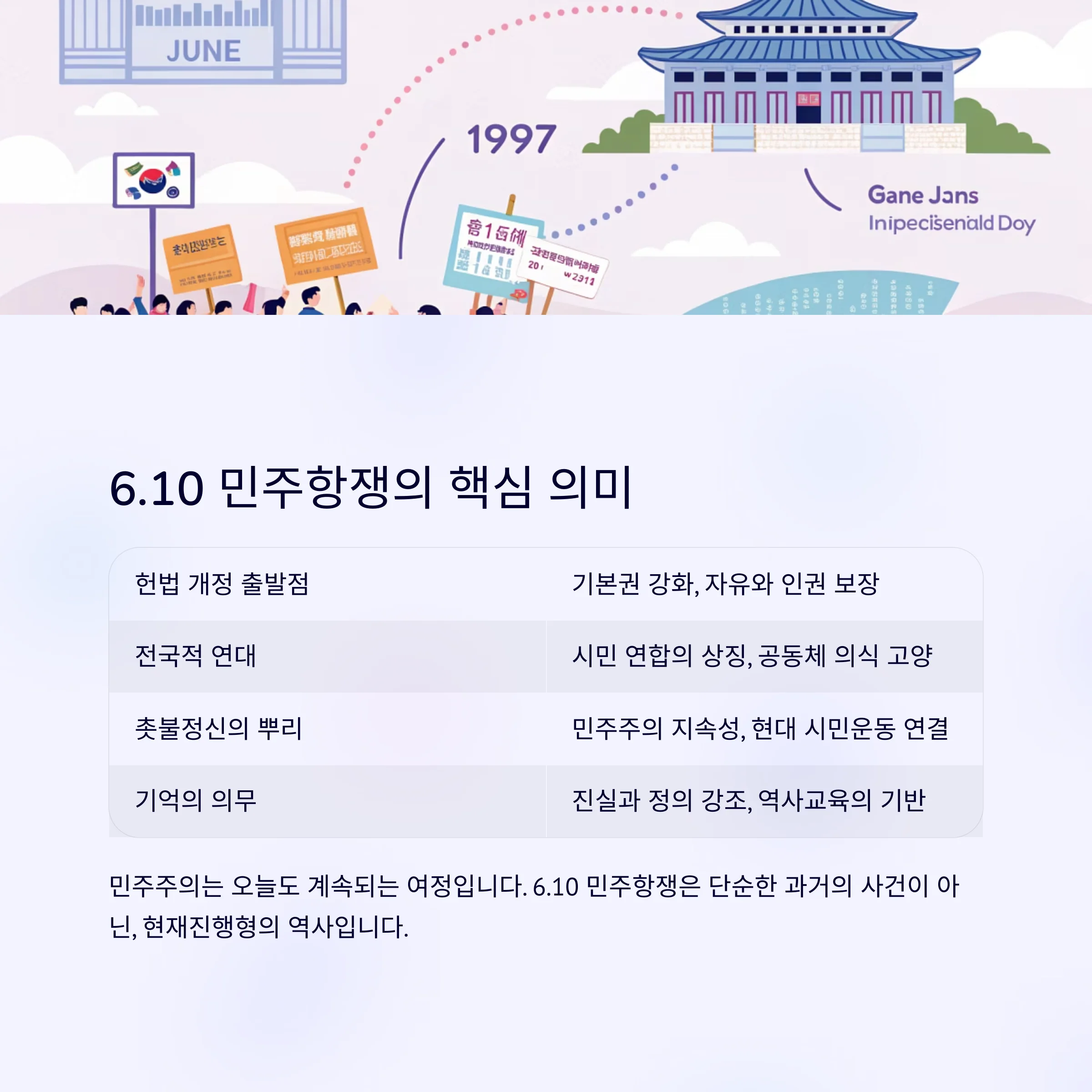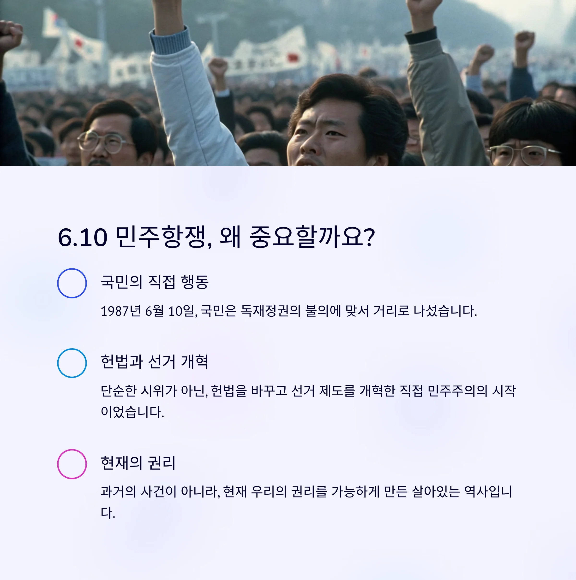 6.10 민주항쟁은 단지 과거의 사건이 아니라, 현재 우리의 권리를 가능하게 만든 역사입니다.