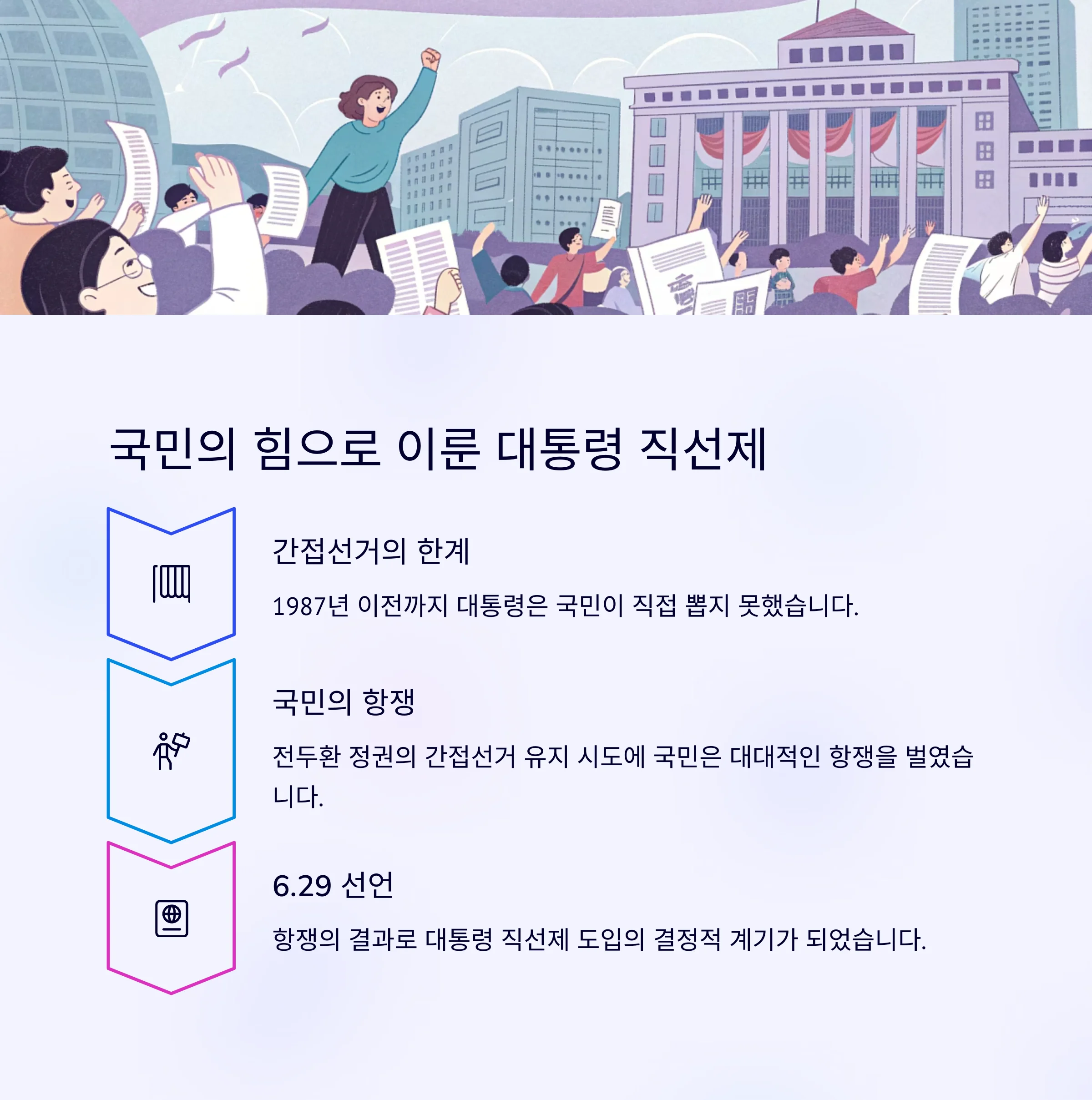 즉, 지금 우리가 투표로 대통령을 뽑을 수 있는 것은 바로 이 항쟁 덕분입니다.