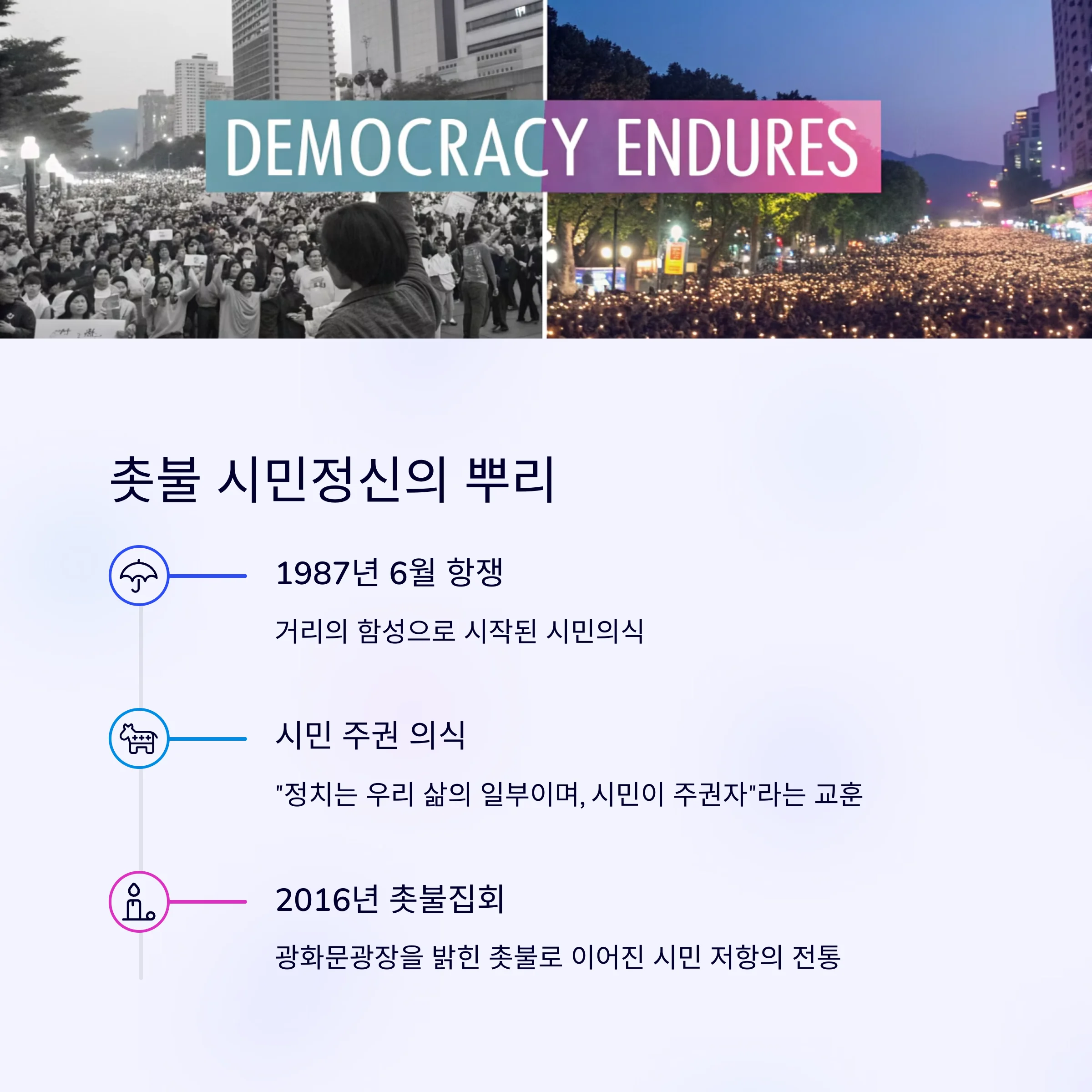 | 촛불정신의 뿌리 | 민주주의 지속성 | 현대 시민운동 연결 |