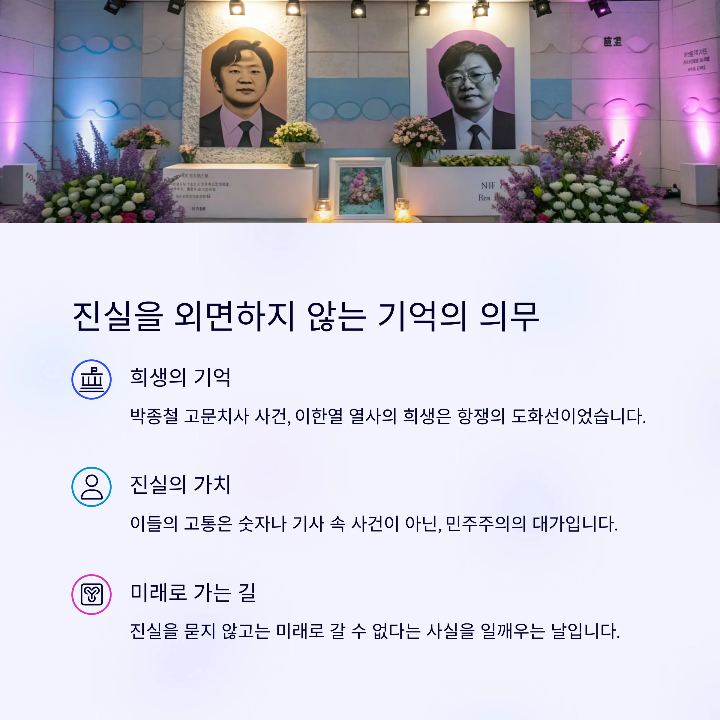 이들의 고통은 결코 숫자나 기사 속 사건이 아닌, 민주주의의 대가이자 우리가 지켜야 할 기억입니다.