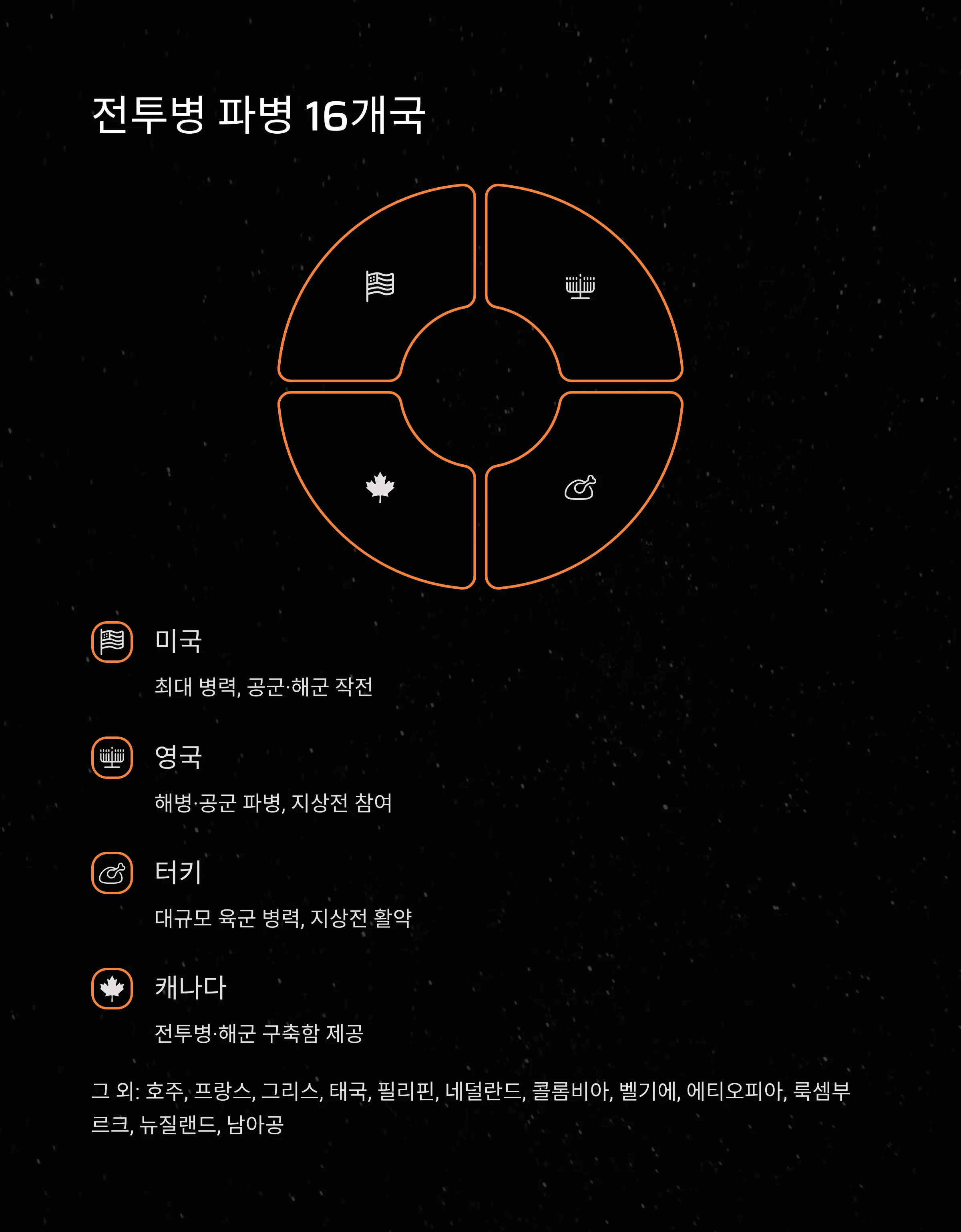 | 비전투 지원국 | 5개국(공식), 일부 소규모 지원국 포함 |