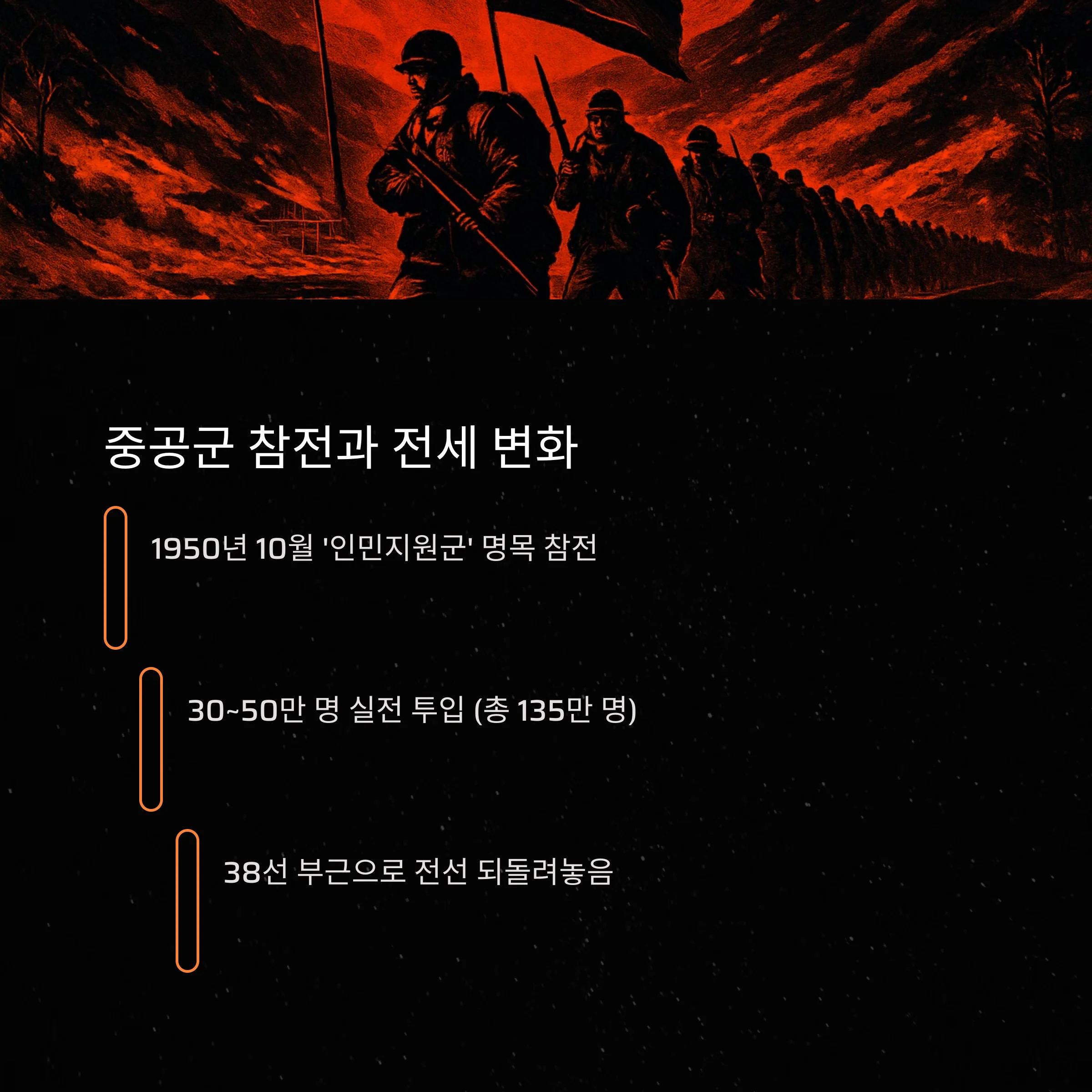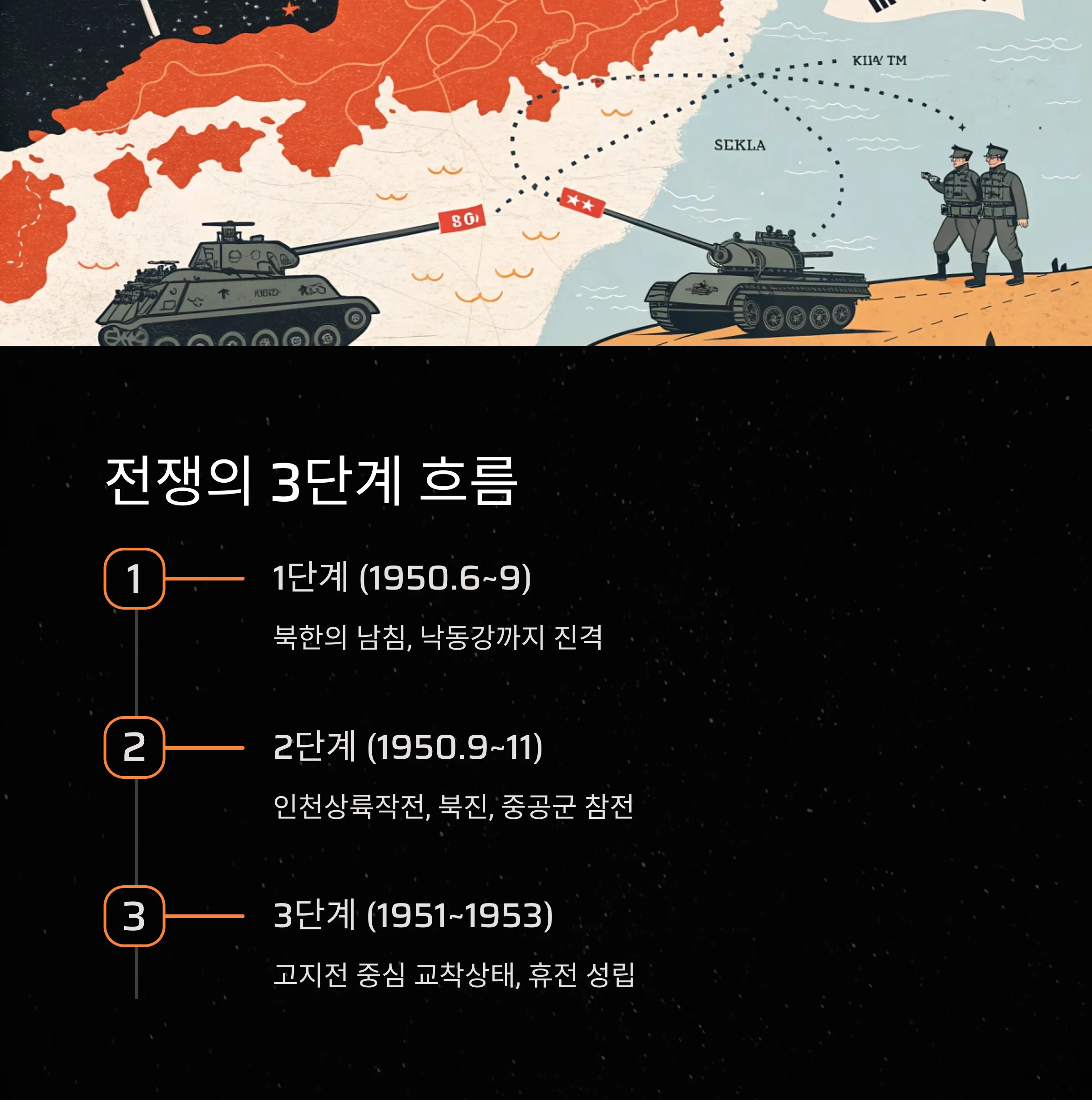 | 전쟁 흐름 | 북한 남침 → 인천상륙작전 및 북진 → 중공군 참전 및 교착 → 휴전 |