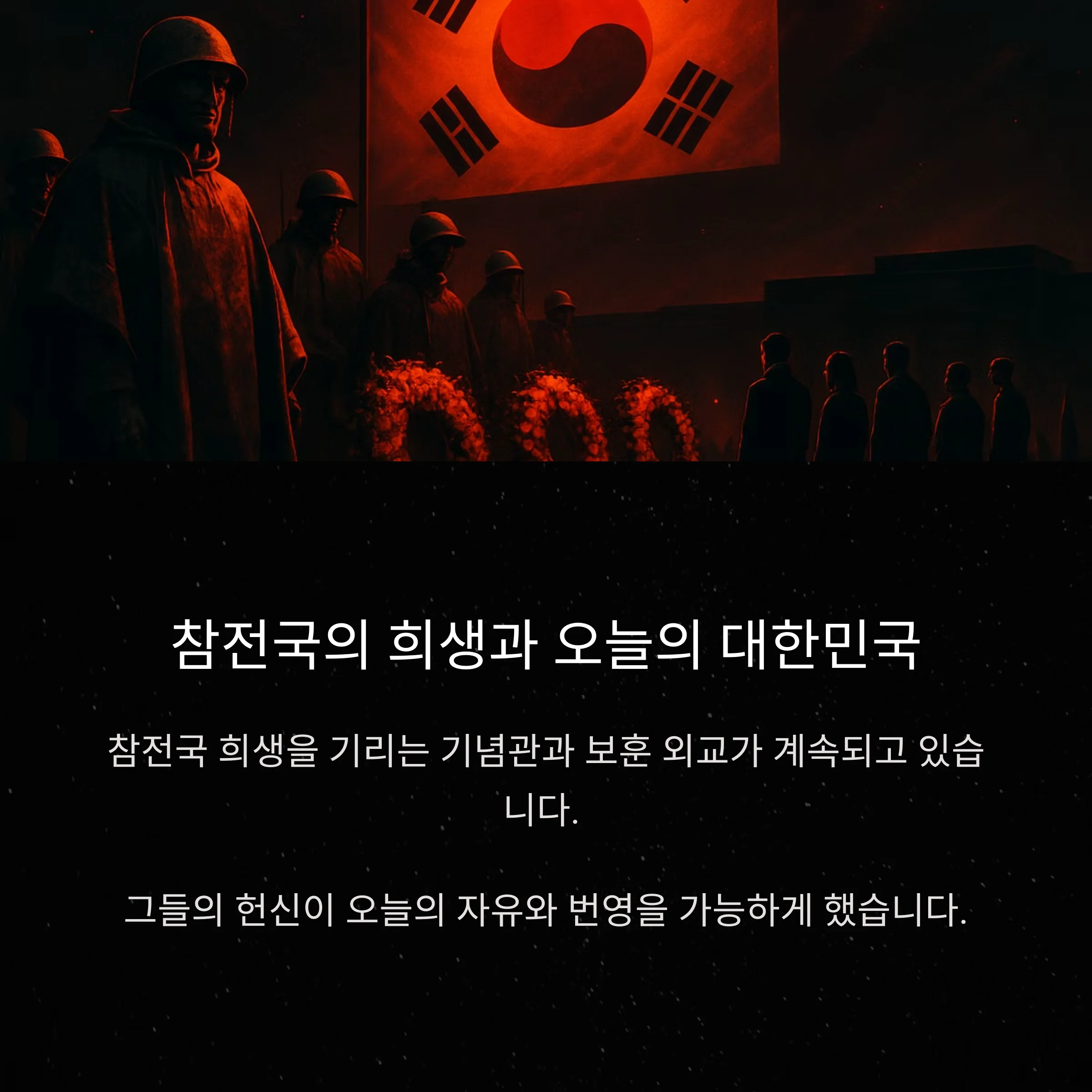오늘날 대한민국은 참전국에 대한 보훈 외교를 지속하고 있으며, 각국의 희생을 기리기 위한 기념관, 현충시설, 교류 사업을 이어가고 있습니다.