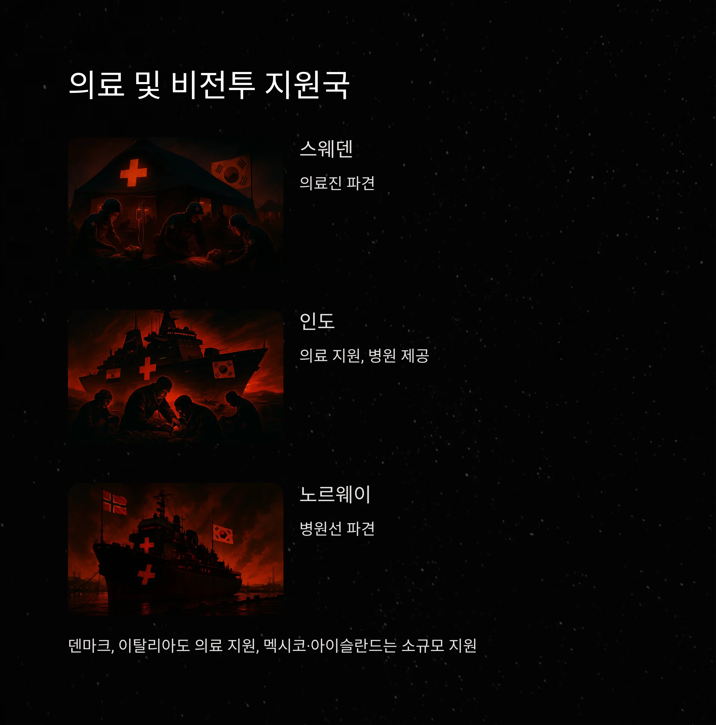 전투병은 파병하지 않았지만 의료진, 물자, 기술 지원을 통해 참전한 국가도 있었습니다.