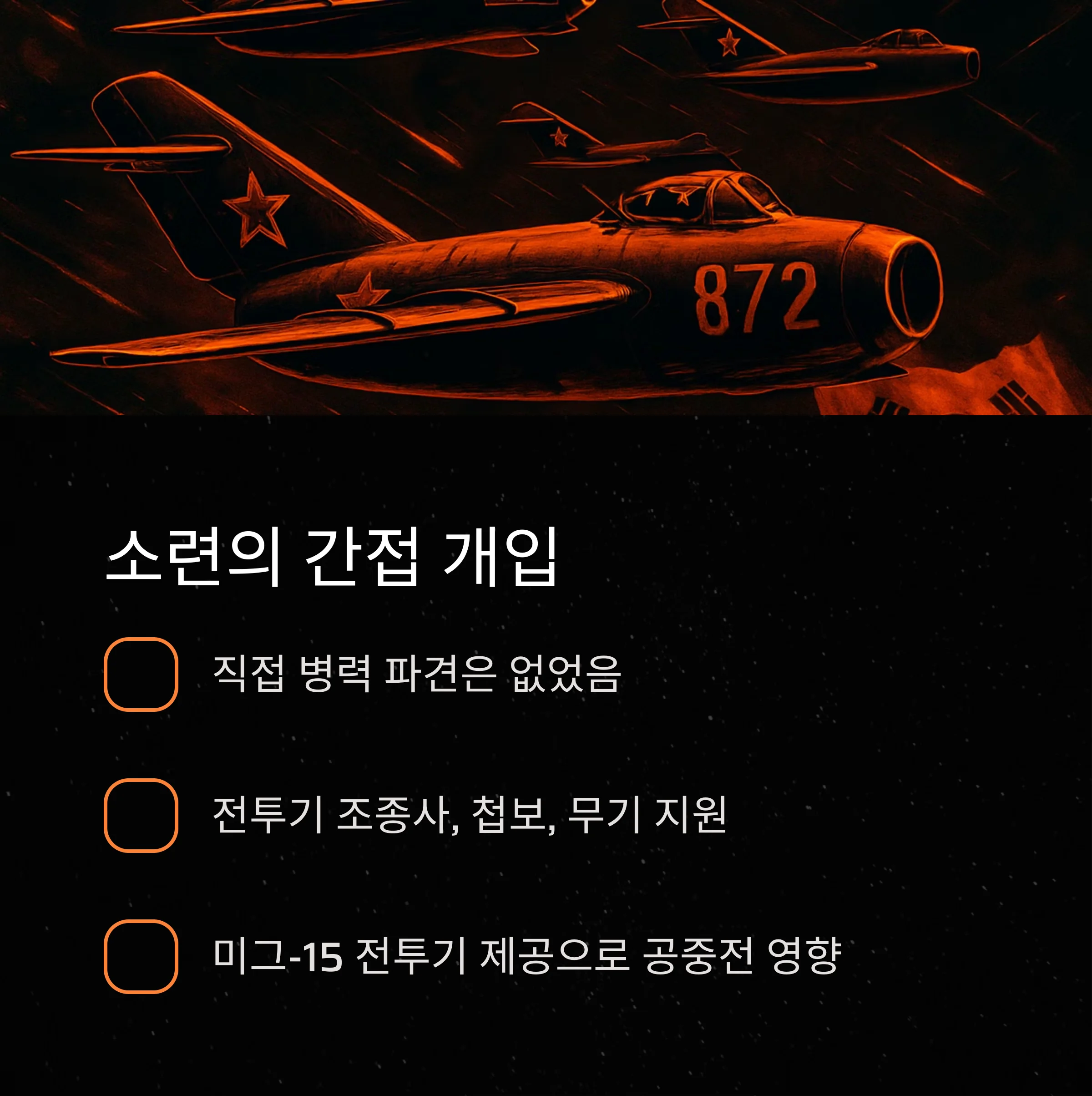 소련은 직접 병력을 파견하지 않았지만 전투기 조종사, 첩보 활동, 무기 제공 등을 통해 북한과 중국을 적극 지원했습니다.